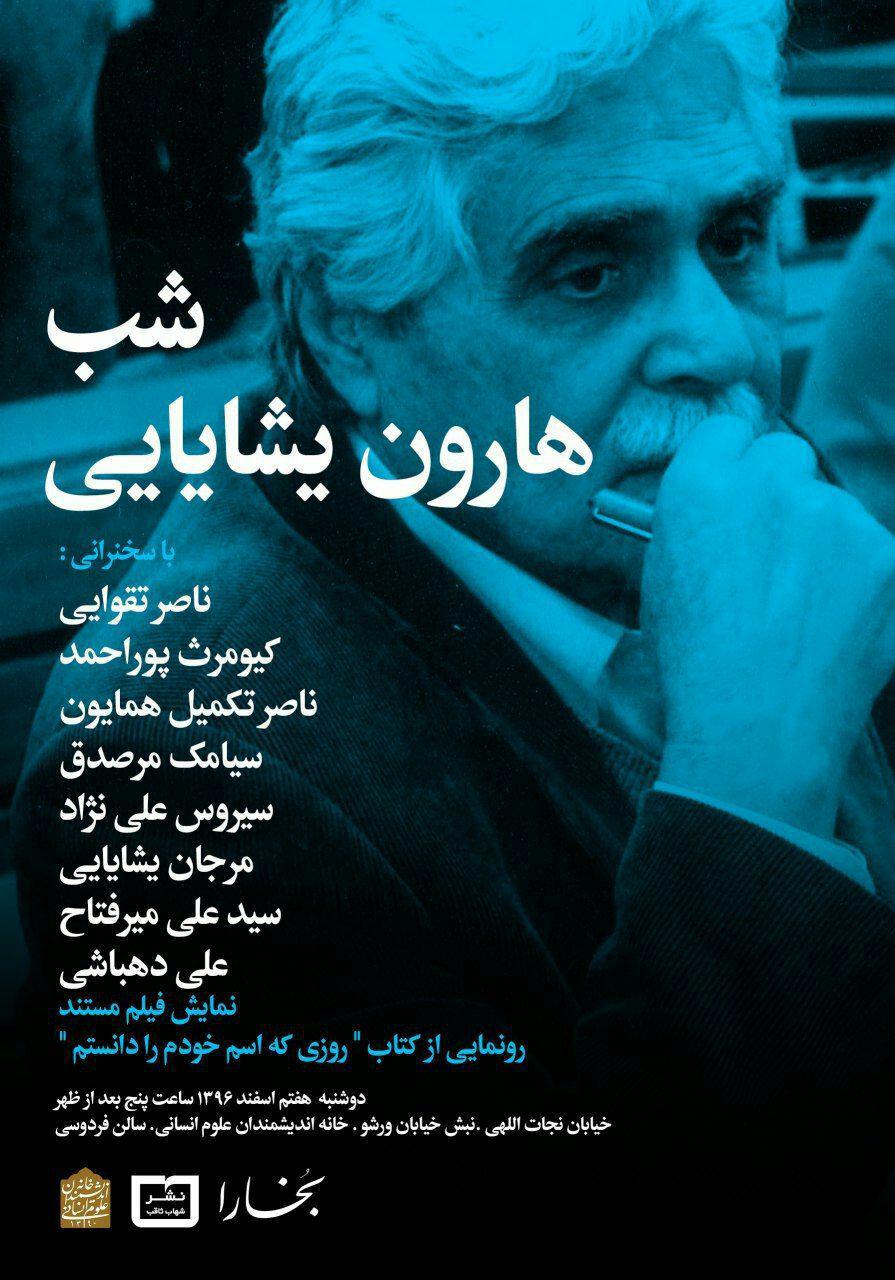 «این شب را به افتخار یک عمر فعالیت هنری و فرهنگی هارون یشایایی برگزار می‌کنیم. امشب از جمله به مناسبت مجموعه داستان ایشان «روزی که اسم خود را دانستم» که انتشارات شهاب ثاقب منتشر کرده برگزار می‌شود که رونمایی این کتاب را هم به همراه داریم و منتظر کتابی از ایشان هستیم که خاطرات ۸۰ سال زندگی جذاب ایشان است. آرش و مرجان (فرزندان هارون یشایایی) باید در این کار همت کنند و خاطرات پدر خود را که شخصی نیست و چندین دهه سیاست و فرهنگ این کشور را در بر دارد، منتشر کنند».