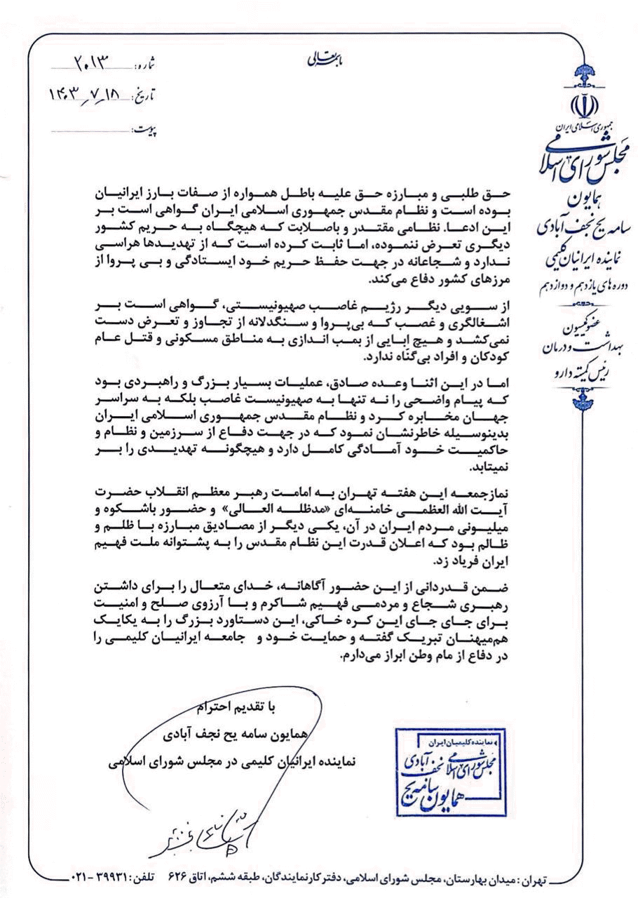 بیانیه دکتر همایون سامه‌یح، نماینده ایرانیان کلیمی در مجلس شورای اسلامی، در رابطه با عملیات وعده صادق٢