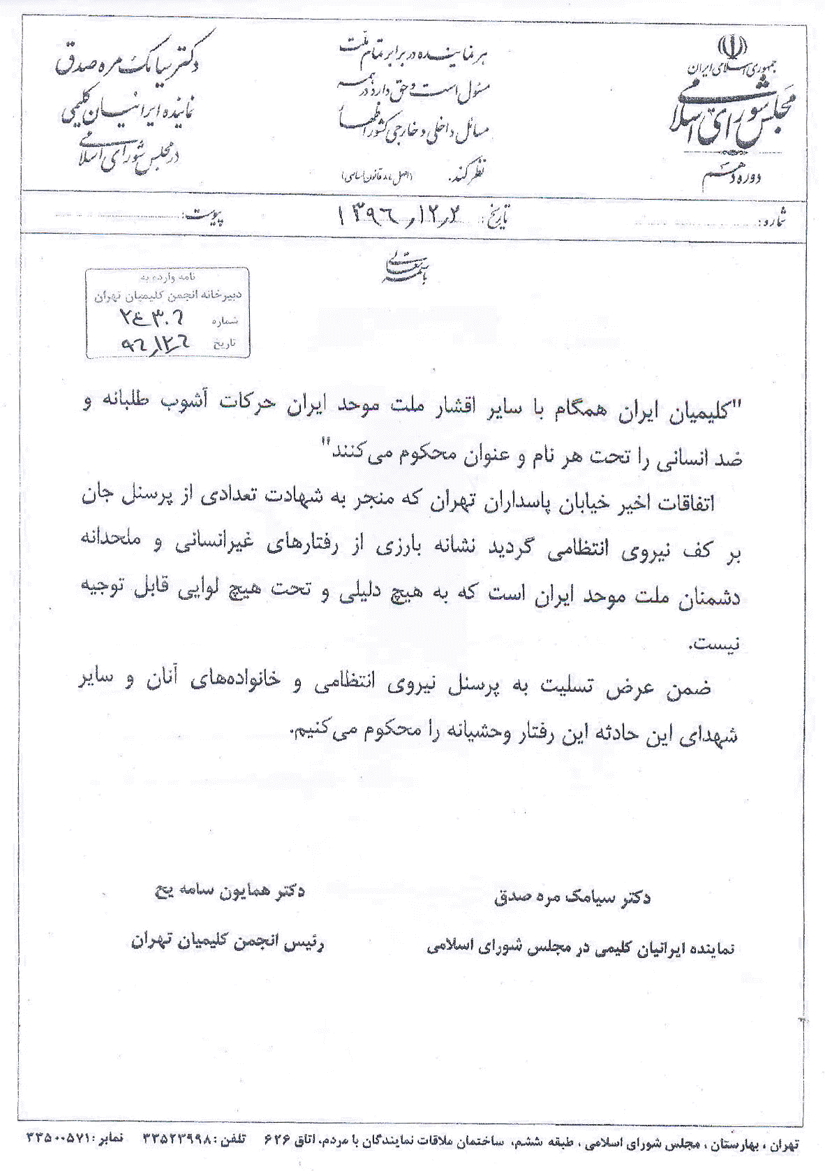 کلیمیان همگام با سایر اقشار موحد ایران حرکات آشوب طلبانه را محکوم می کنند