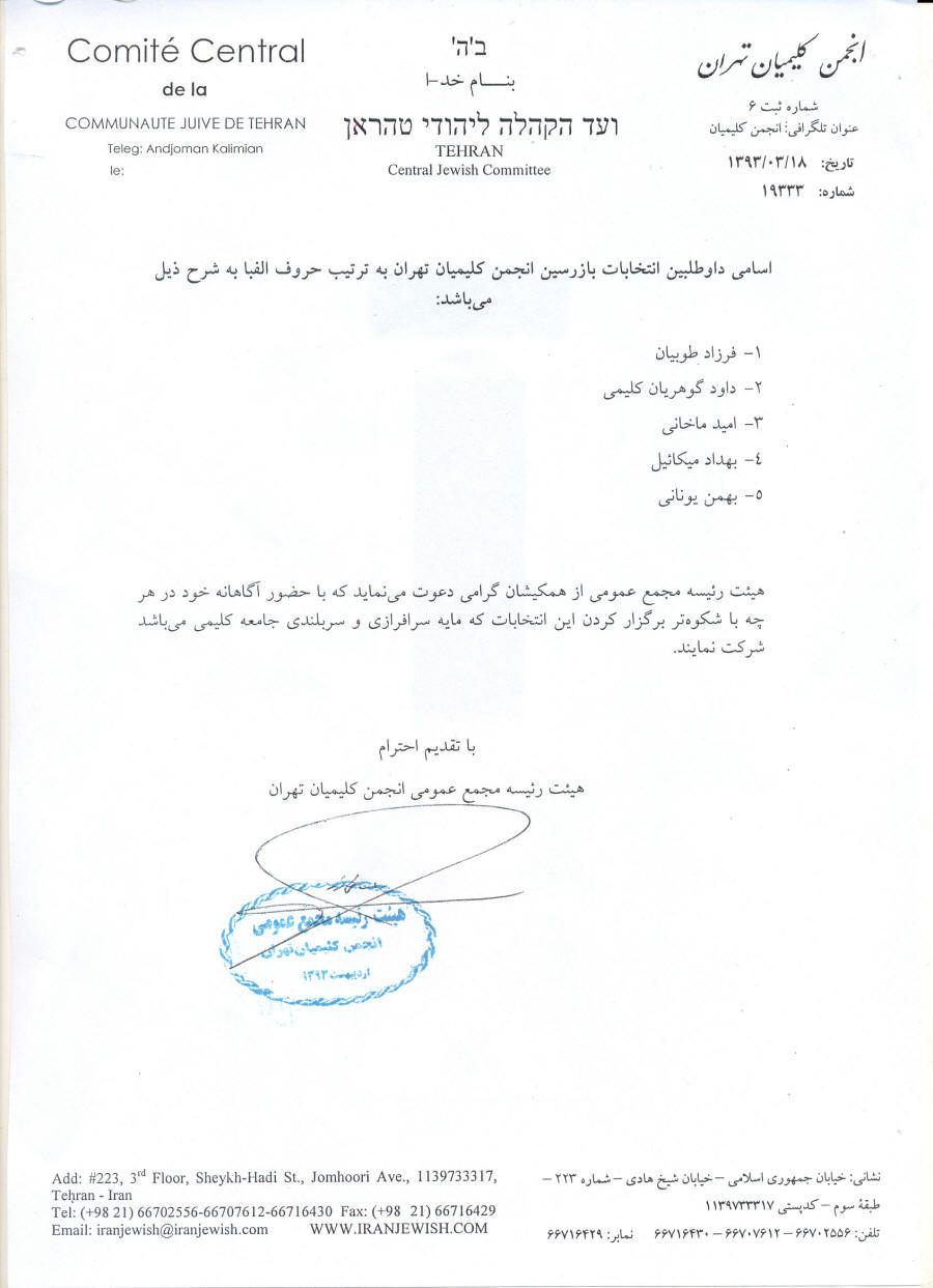 اطلاعیه شماره 3 هیئت رئیسه مجمع عمومی انجمن کلیمیان تهران اسامی داوطلبین