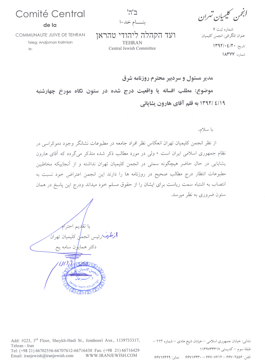 اعتراض انجمن کلیمیان تهران نسبت به انتصاب سمت ریاست انجمن کلیمیان به اشخاص دیگر
