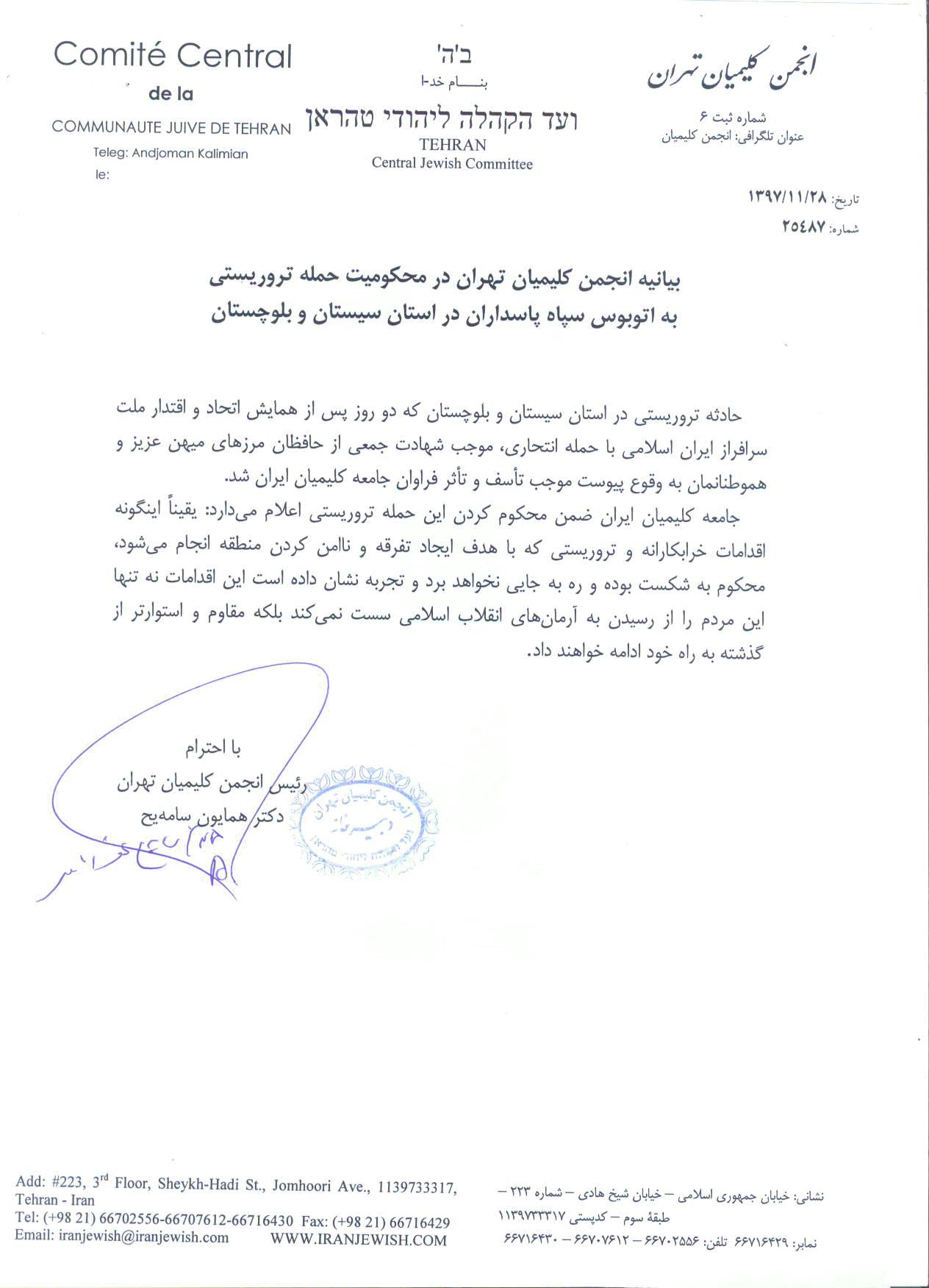 جامعه کلیمیان ایران ضمن محکوم کردن این حمله تروریستی اعلام می دارد: یقیناً